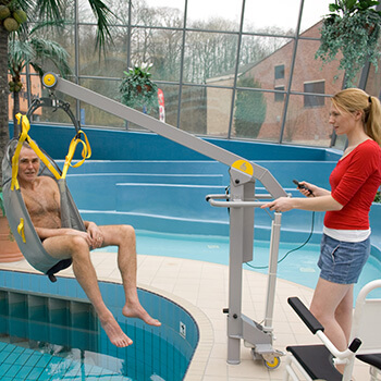 El elevador de personas para piscinas es compacto, ergonómico y fácil de trasladar puesto que va provisto de ruedas.