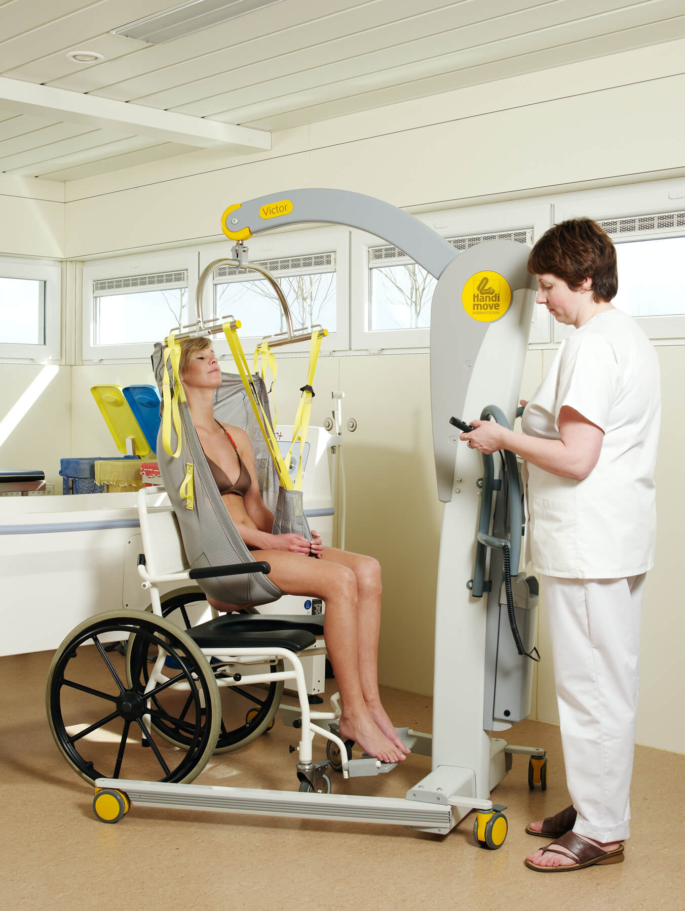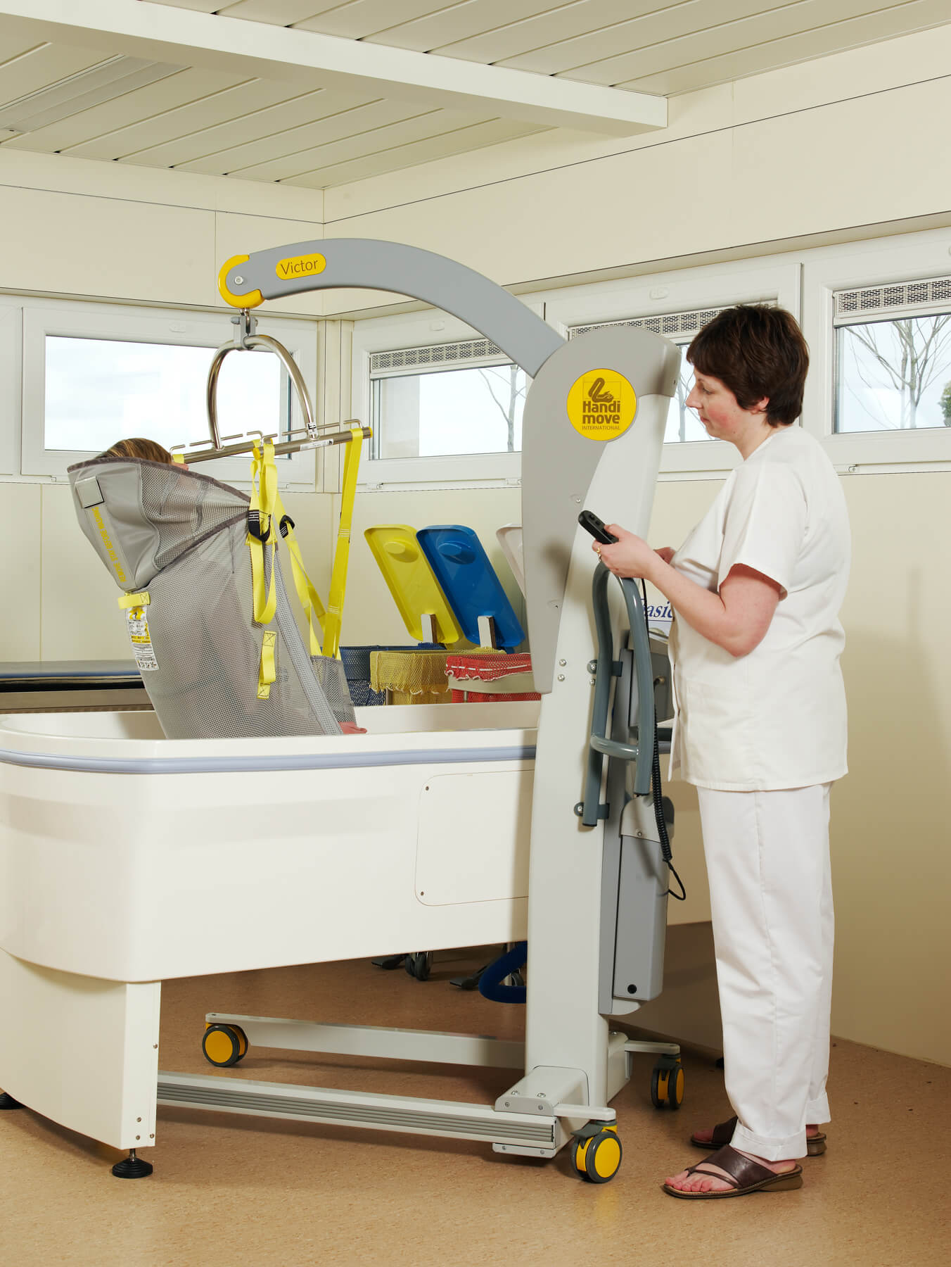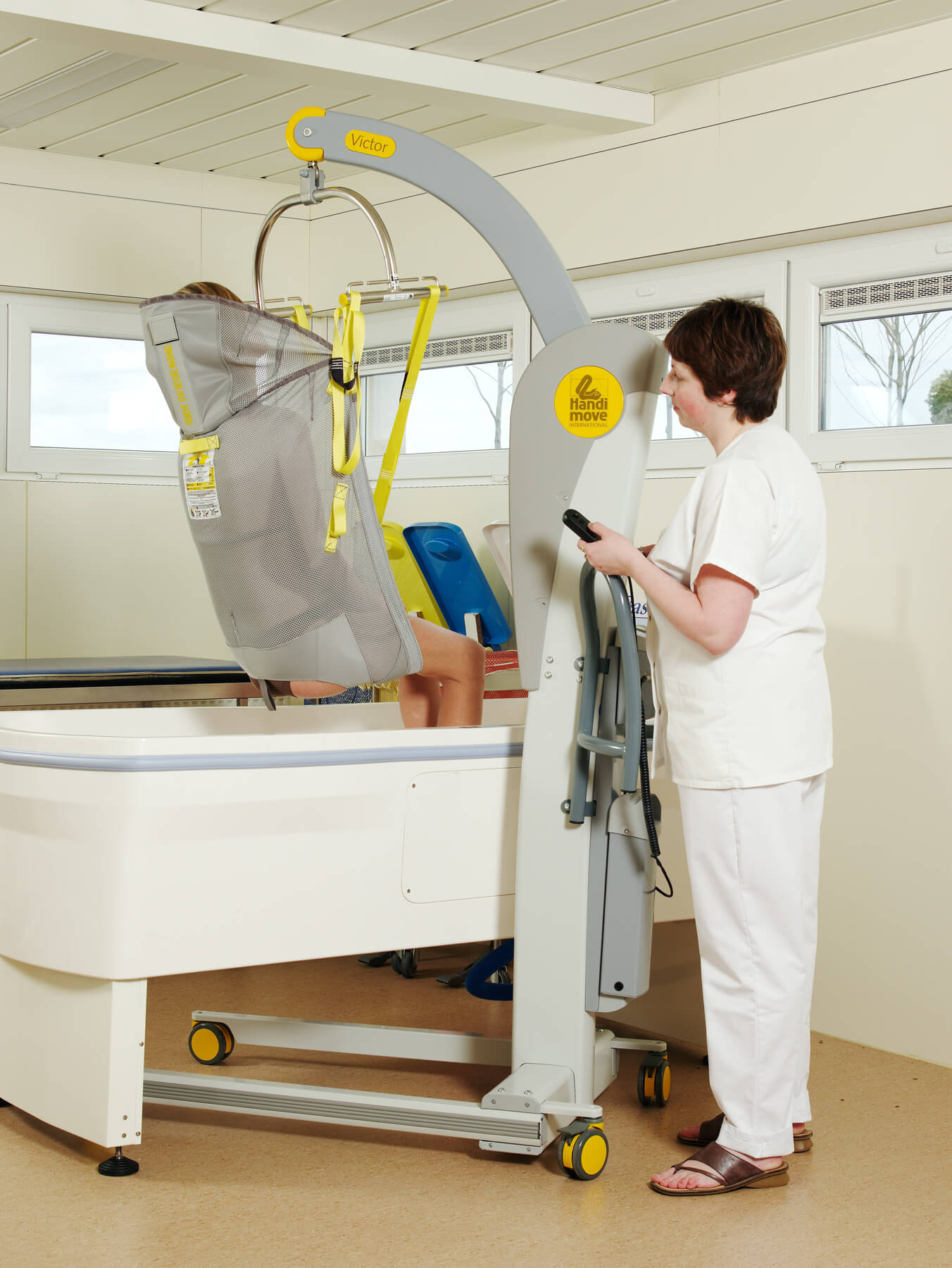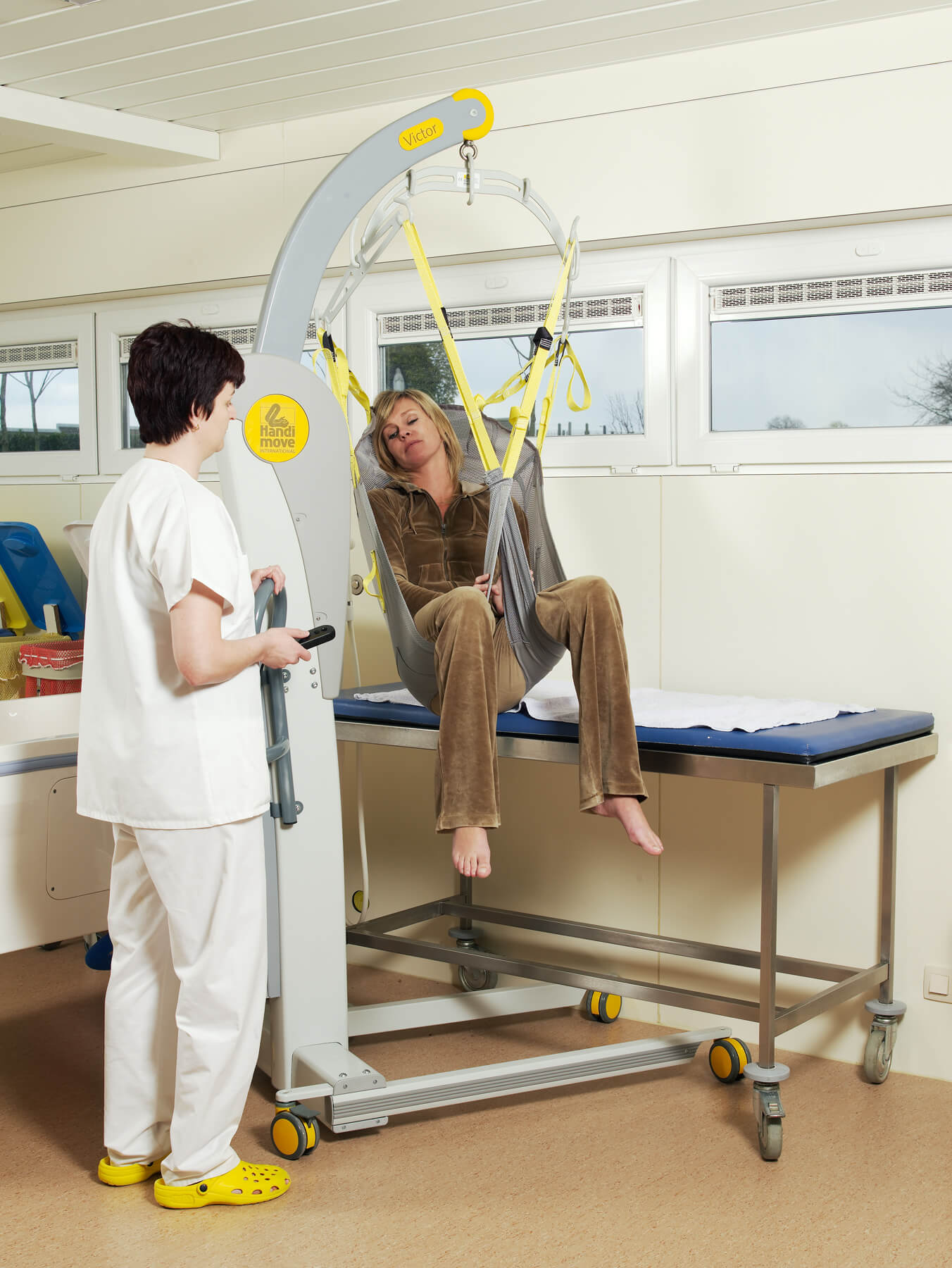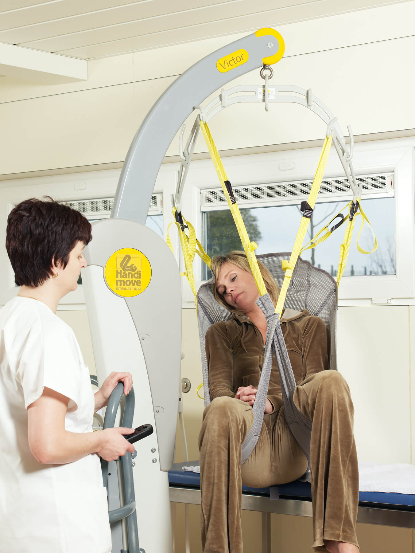 El modelo Victor es robusto, pero compacto. Las asas ergonómicas lo hacen más manejable, incluso en espacios reducidos. La base con anchura regulable eléctricamente se adapta a la perfección alrededor de una silla de ruedas o un sillón. Puede utilizarse en combinación con los bastidores-manos y/o los arneses exclusivos de Handi-Move. Los sistemas son fácilmente intercambiables en función de las características del usuario. También está disponible con una balanza digital.