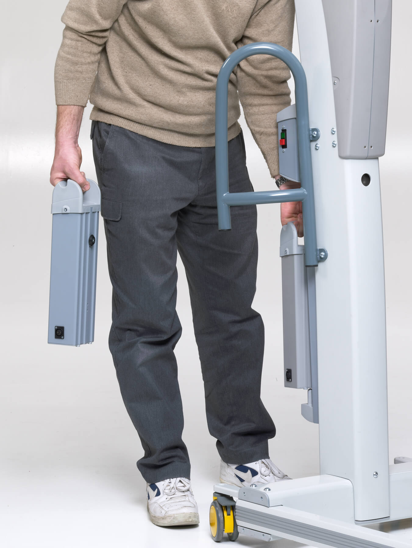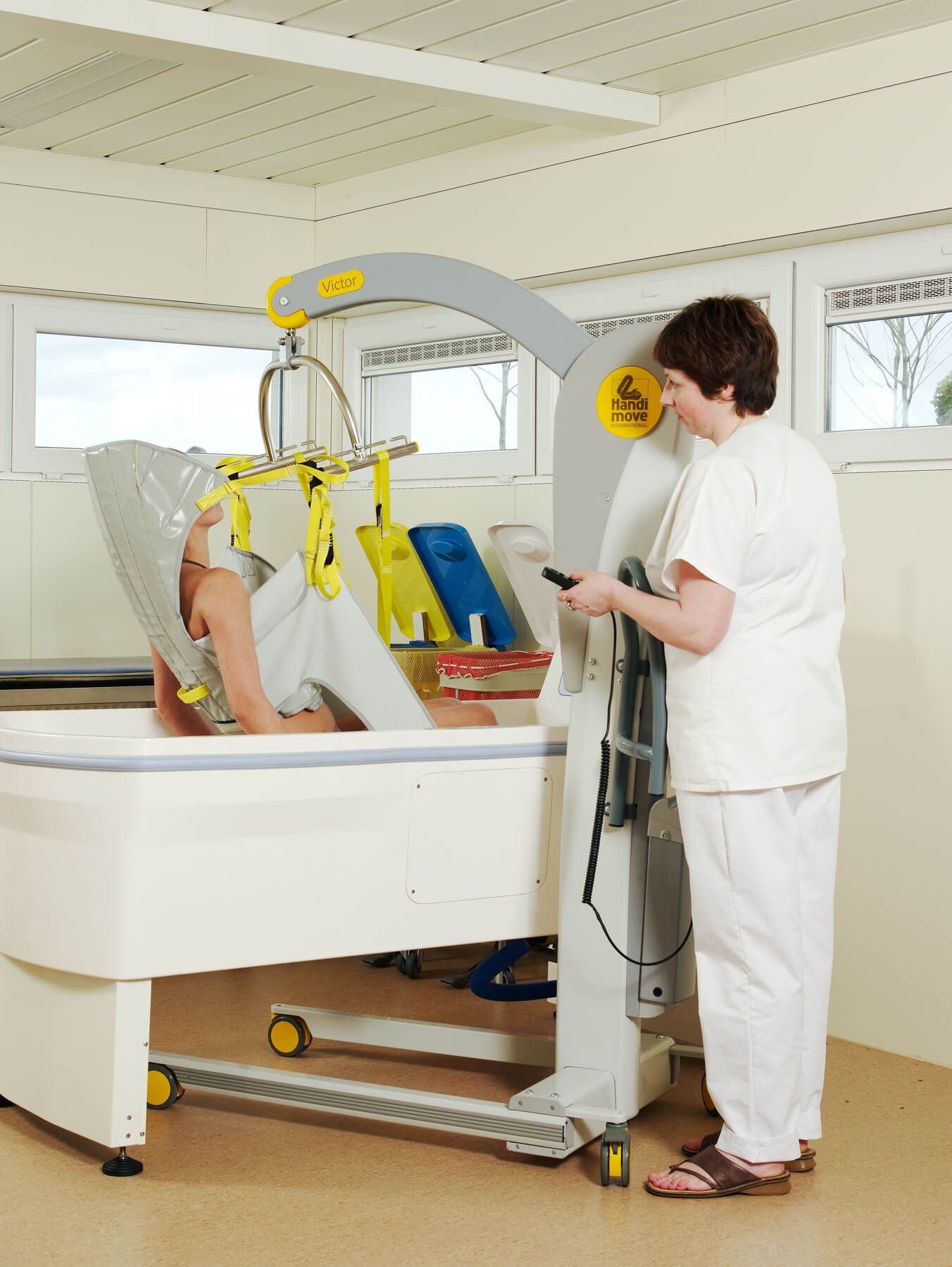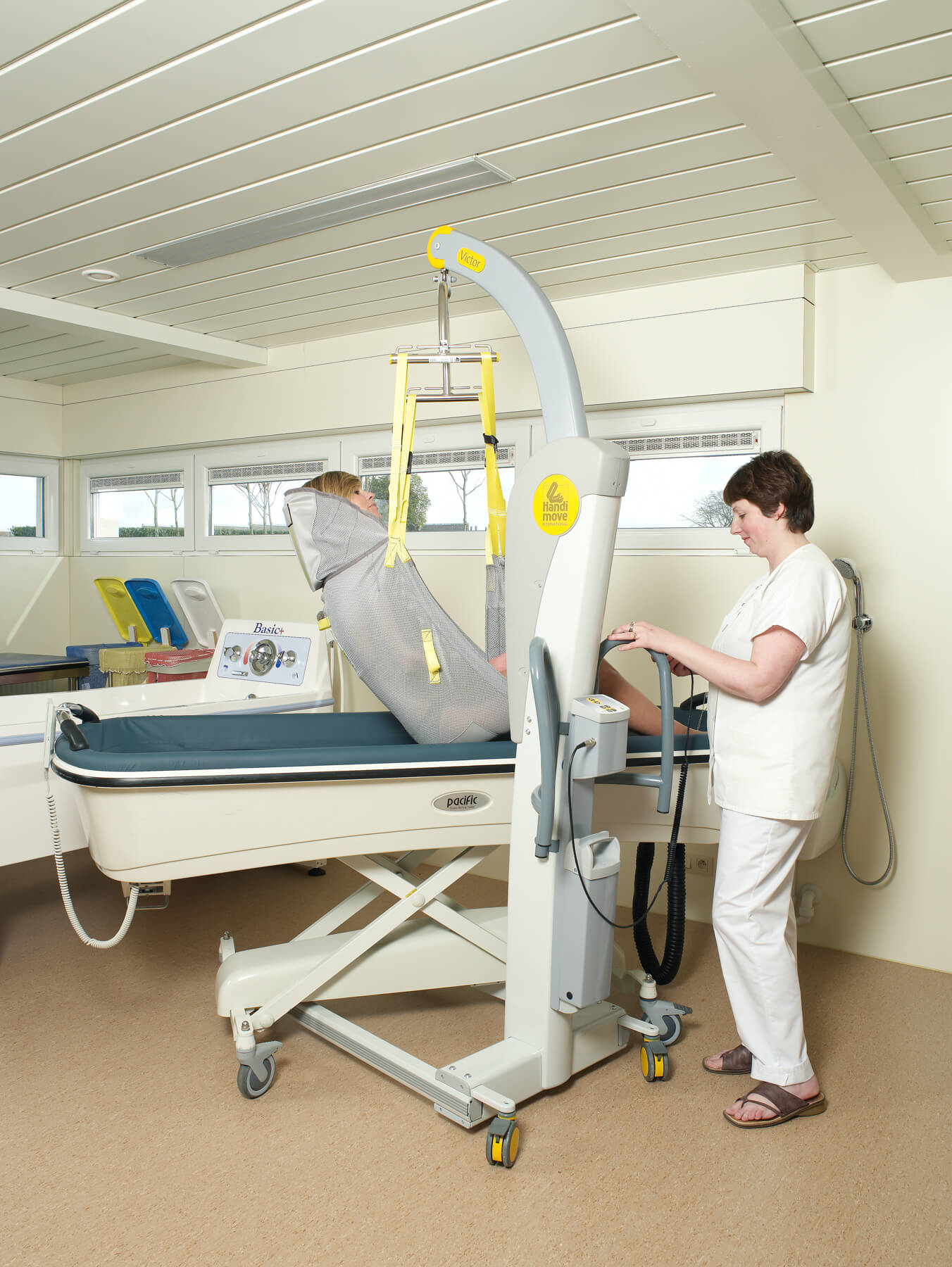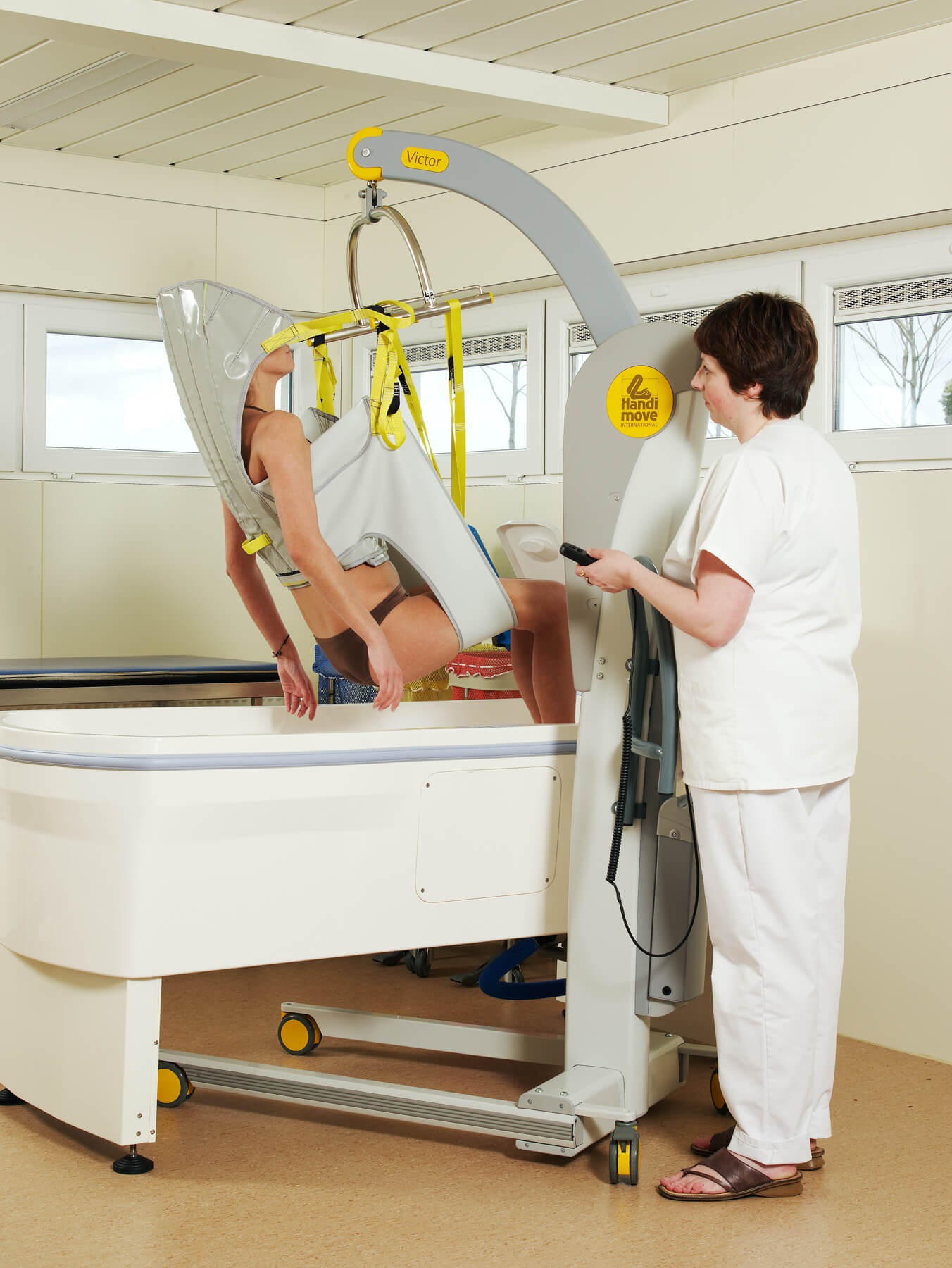 El modelo Victor es robusto, pero compacto. Las asas ergonómicas lo hacen más manejable, incluso en espacios reducidos. La base con anchura regulable eléctricamente se adapta a la perfección alrededor de una silla de ruedas o un sillón. Puede utilizarse en combinación con los bastidores-manos y/o los arneses exclusivos de Handi-Move. Los sistemas son fácilmente intercambiables en función de las características del usuario. También está disponible con una balanza digital.