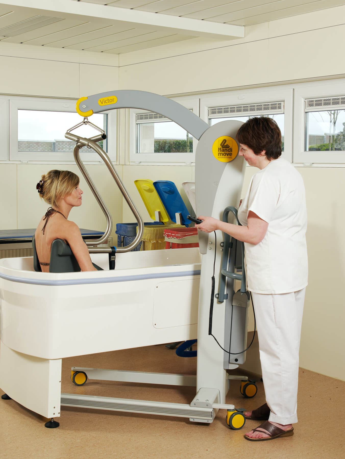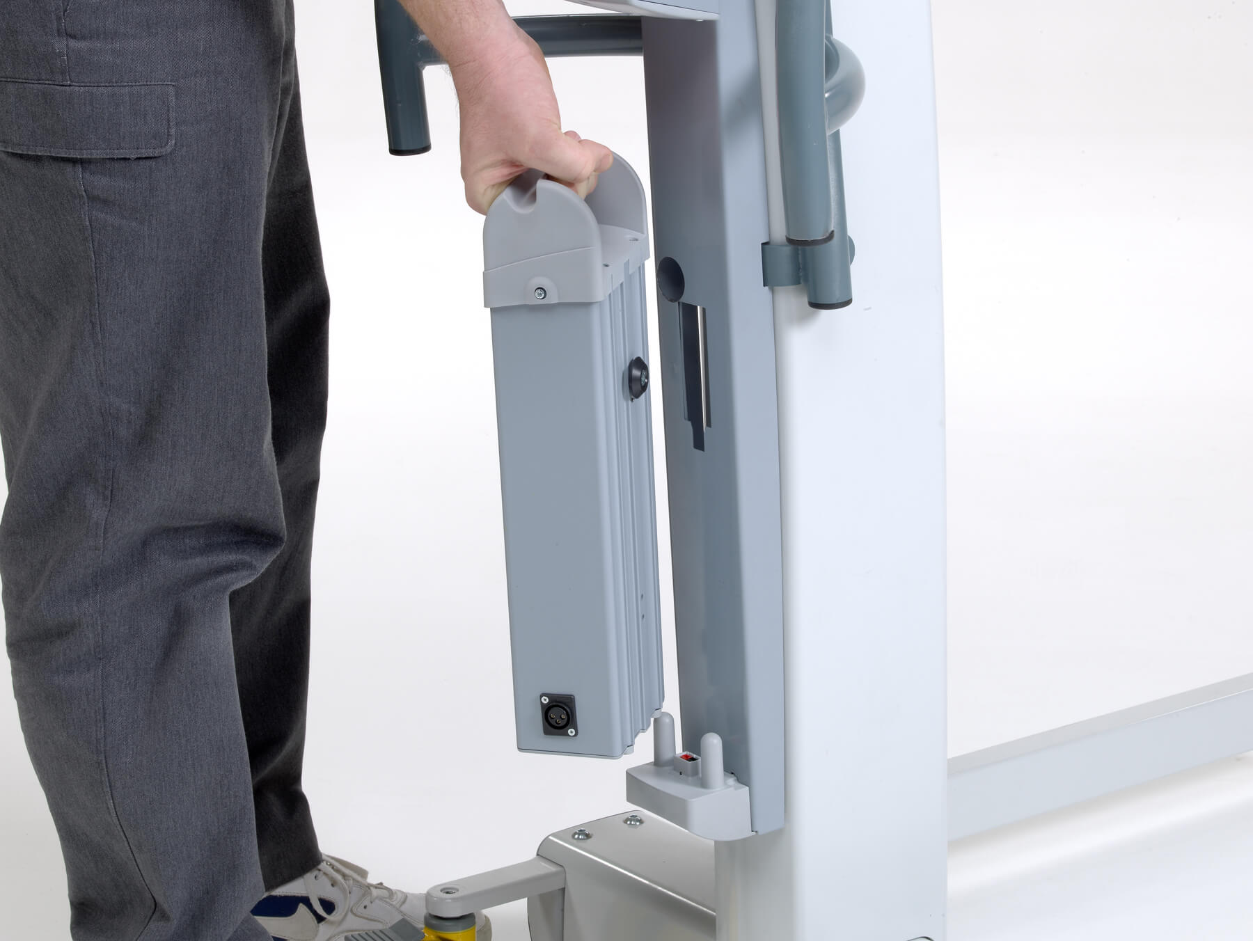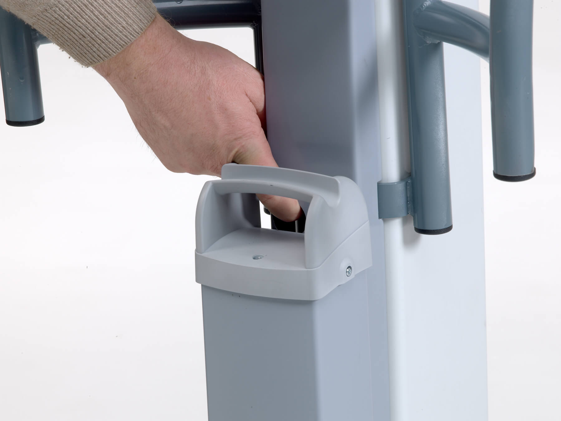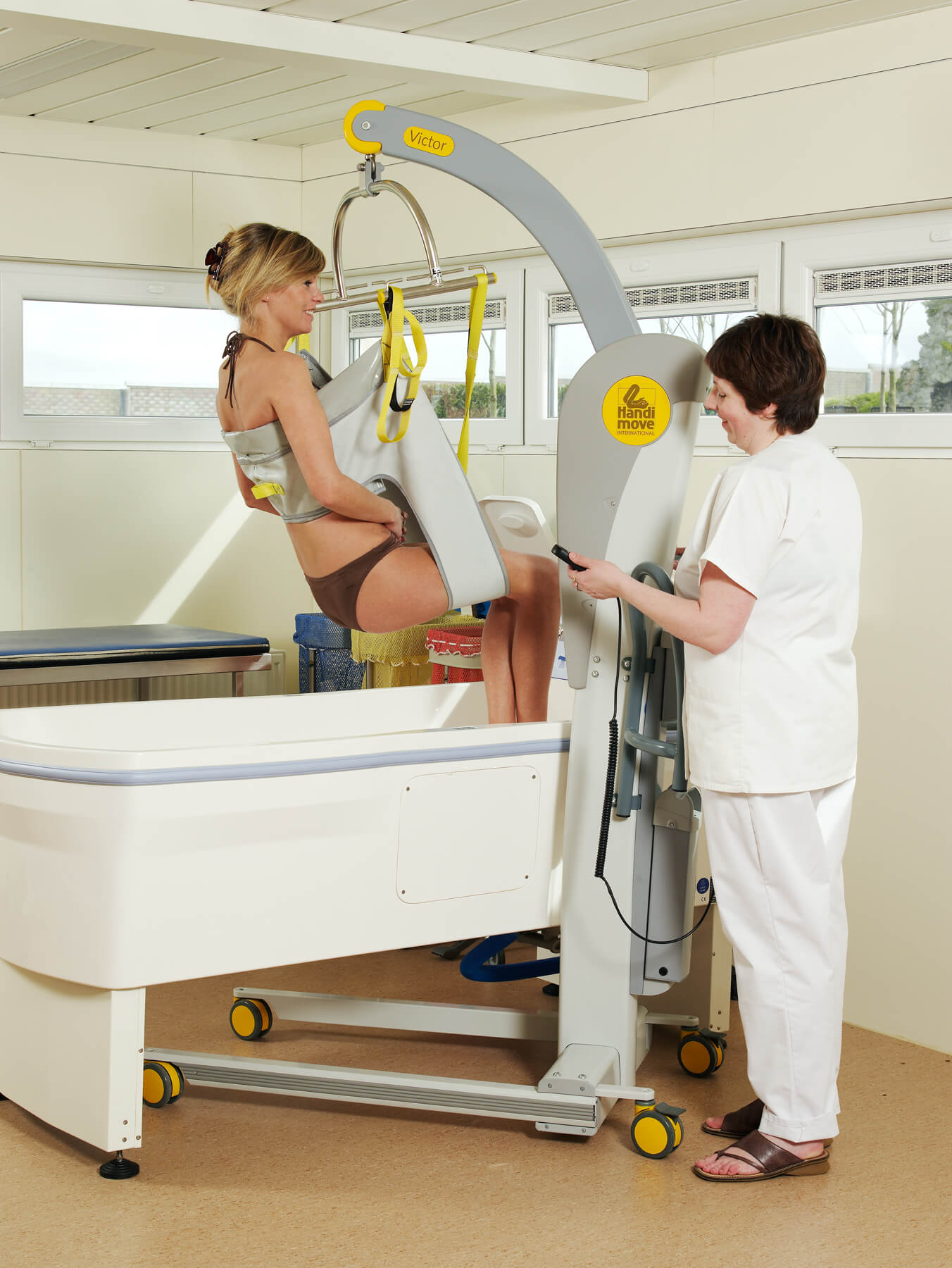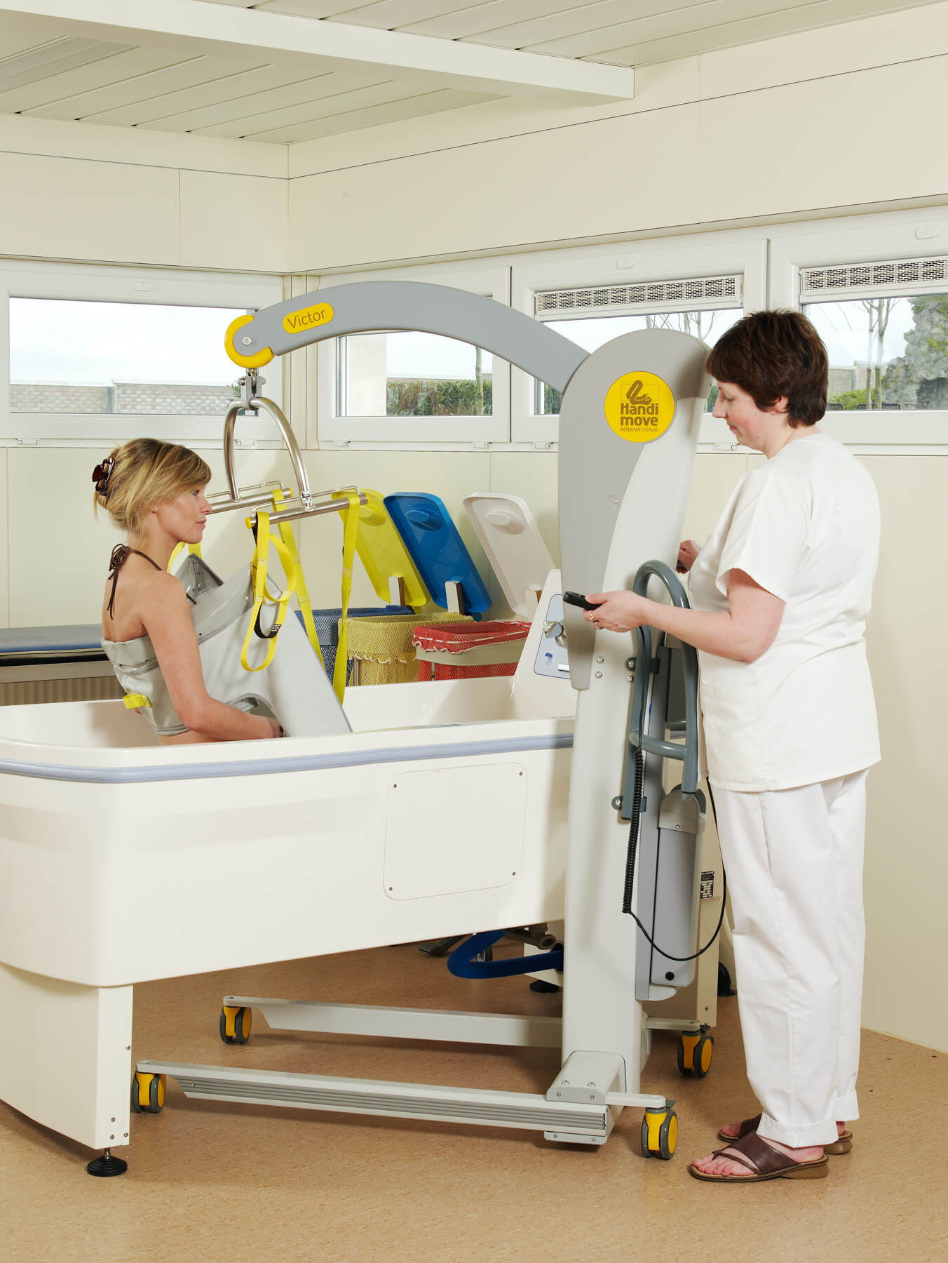 El modelo Victor es robusto, pero compacto. Las asas ergonómicas lo hacen más manejable, incluso en espacios reducidos. La base con anchura regulable eléctricamente se adapta a la perfección alrededor de una silla de ruedas o un sillón. Puede utilizarse en combinación con los bastidores-manos y/o los arneses exclusivos de Handi-Move. Los sistemas son fácilmente intercambiables en función de las características del usuario. También está disponible con una balanza digital.