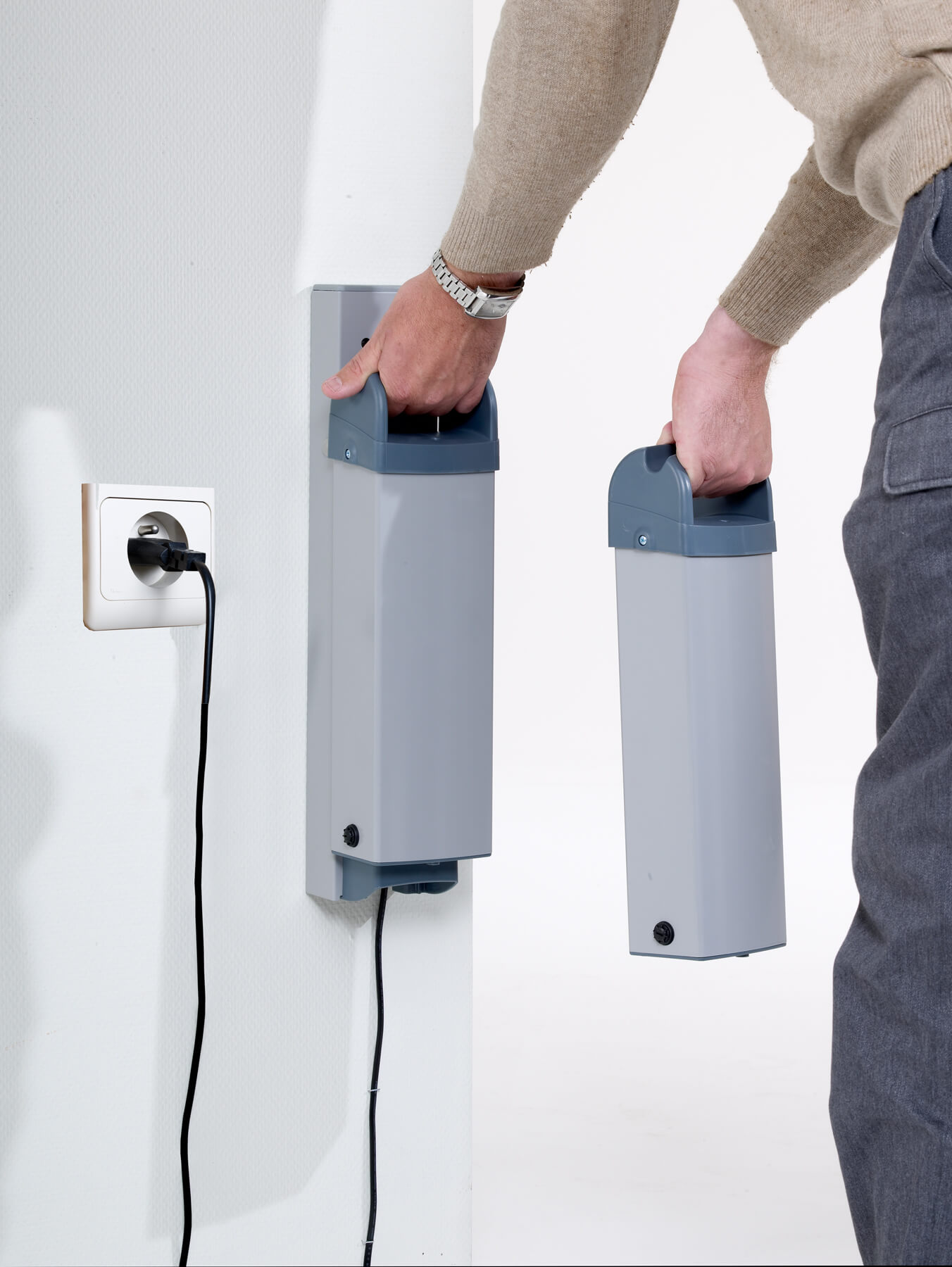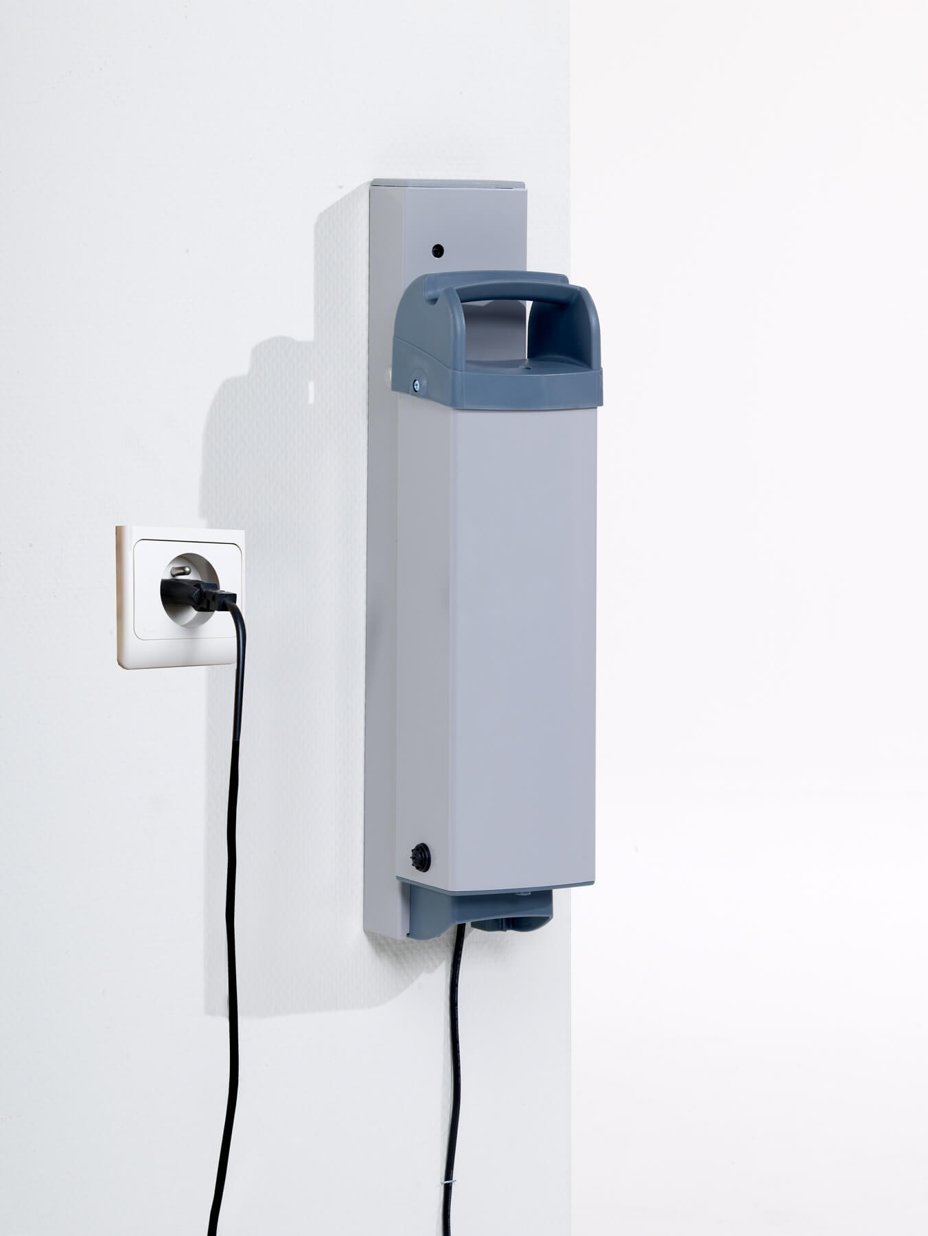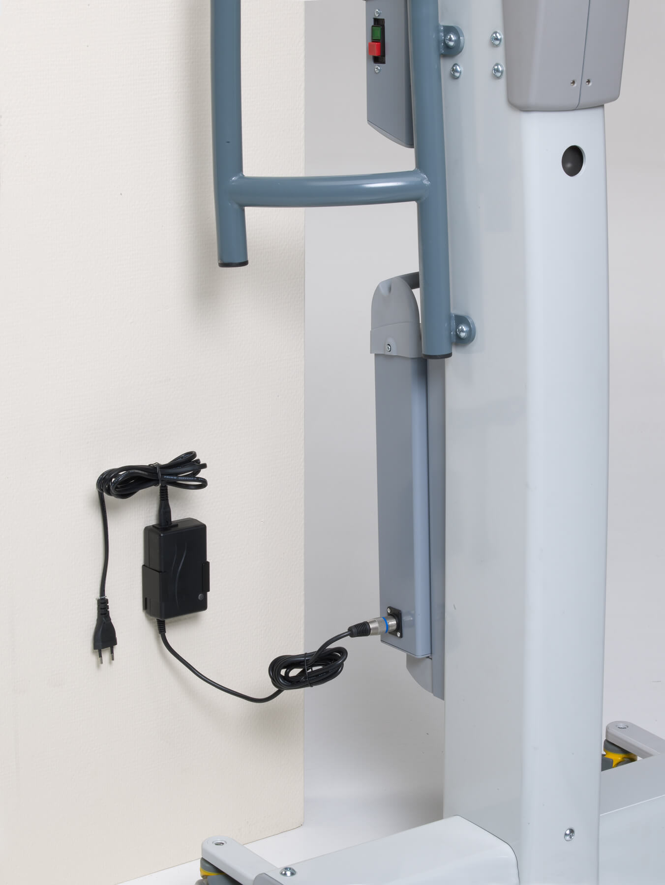 La batería intercambiable se carga directamente en la grúa o mediante un cargador de pared. Su autonomía es muy elevada: 180 traslados de 90 kg.