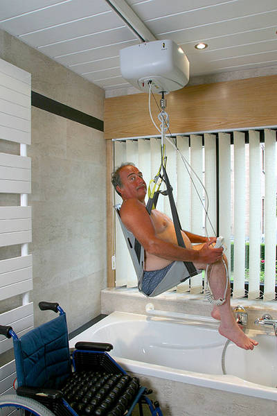 Se puede bajar la silla hasta el fondo de la bañera a la que se acopla perfectamente, tomando su forma. Puede colgarse de cualquier sistema de elevación Aidmoving - Handi-Move. Además su posición es regulable.