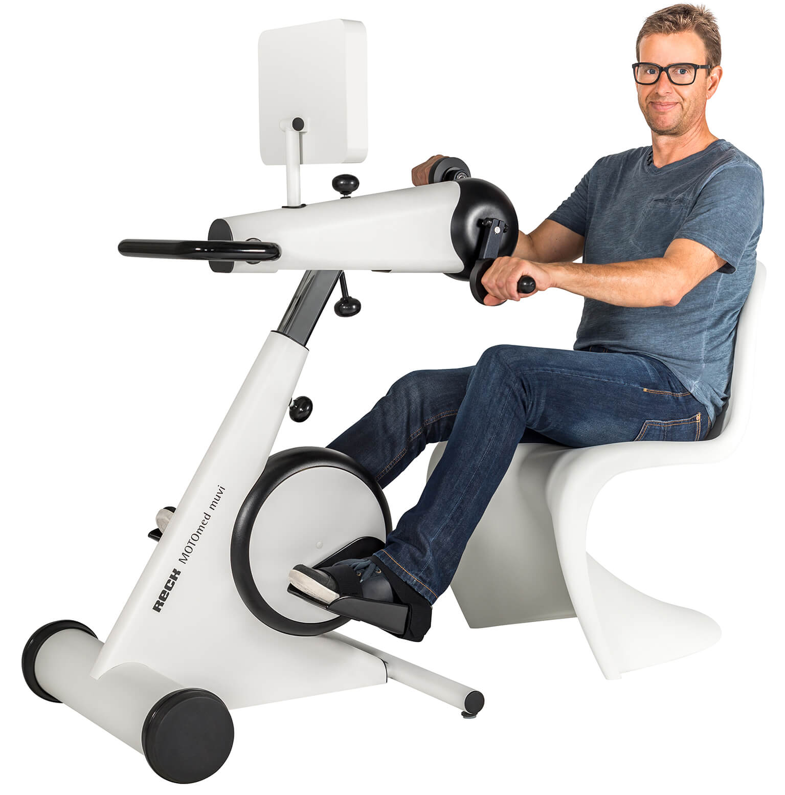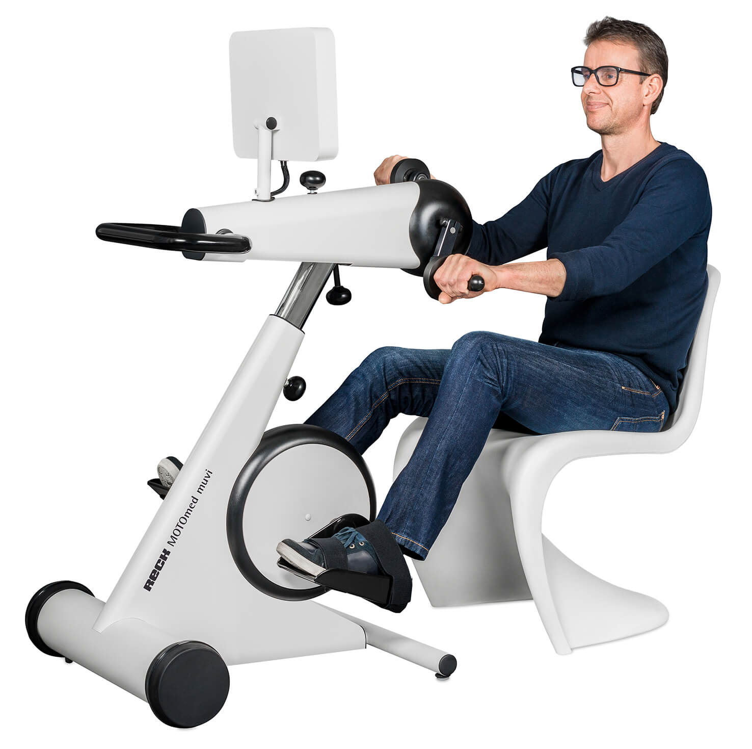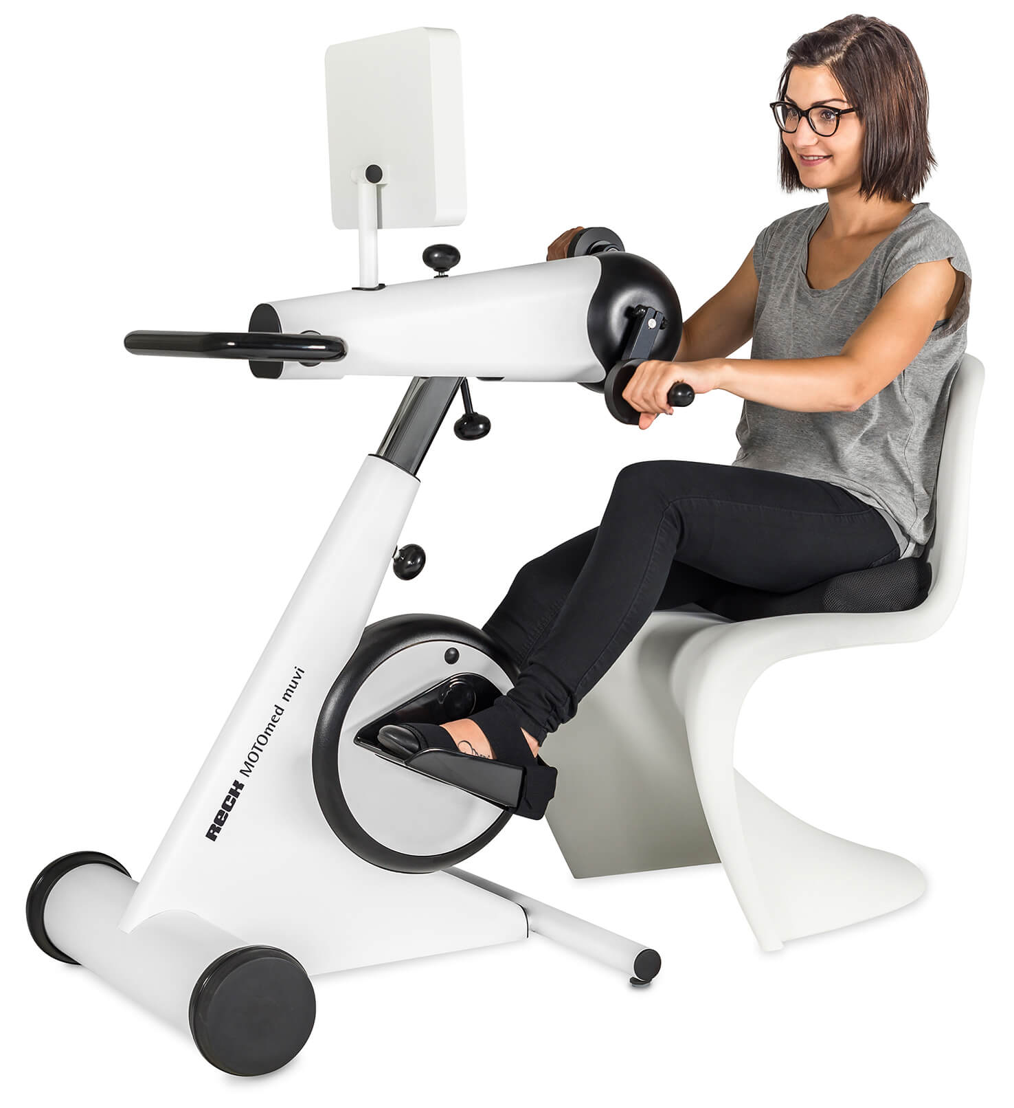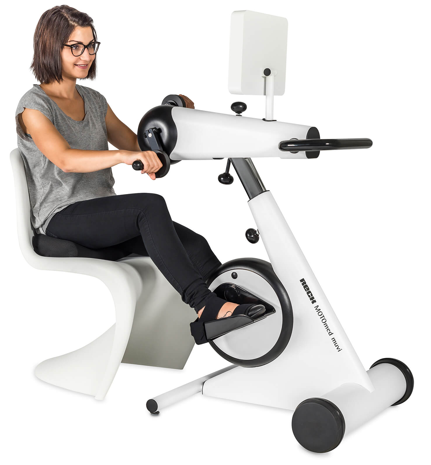 En los equipos cinesiterapéuticos de la familia MOTOmed el paciente mismo decide si quiere entrenar con o sin motor. El concepto innovador del entrenamiento simultáneo para todo el cuerpo es una característica que hace el MOTOmed muvi único. El movimiento controlado digital y de forma inteligente responde a cada usuario individualmente. Con un diseño agradable y un concepto de higiene mejorado cumplen con todas expectativas referente a calidad, manejo y ergonomía. Así existe una gran variedad de posibilidades y el nuevo MOTOmed muvi es ideal para las personas modernas en movimiento.