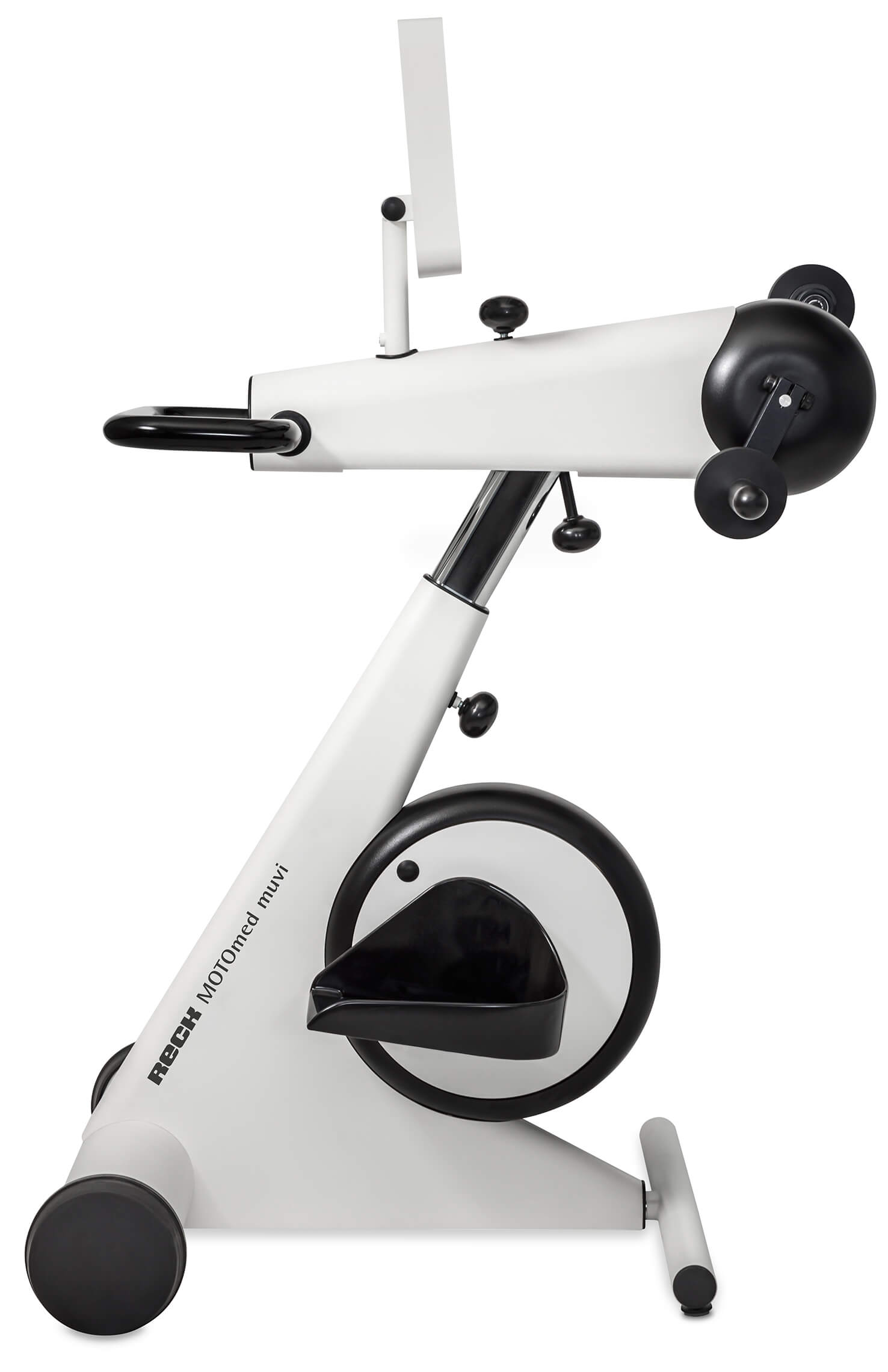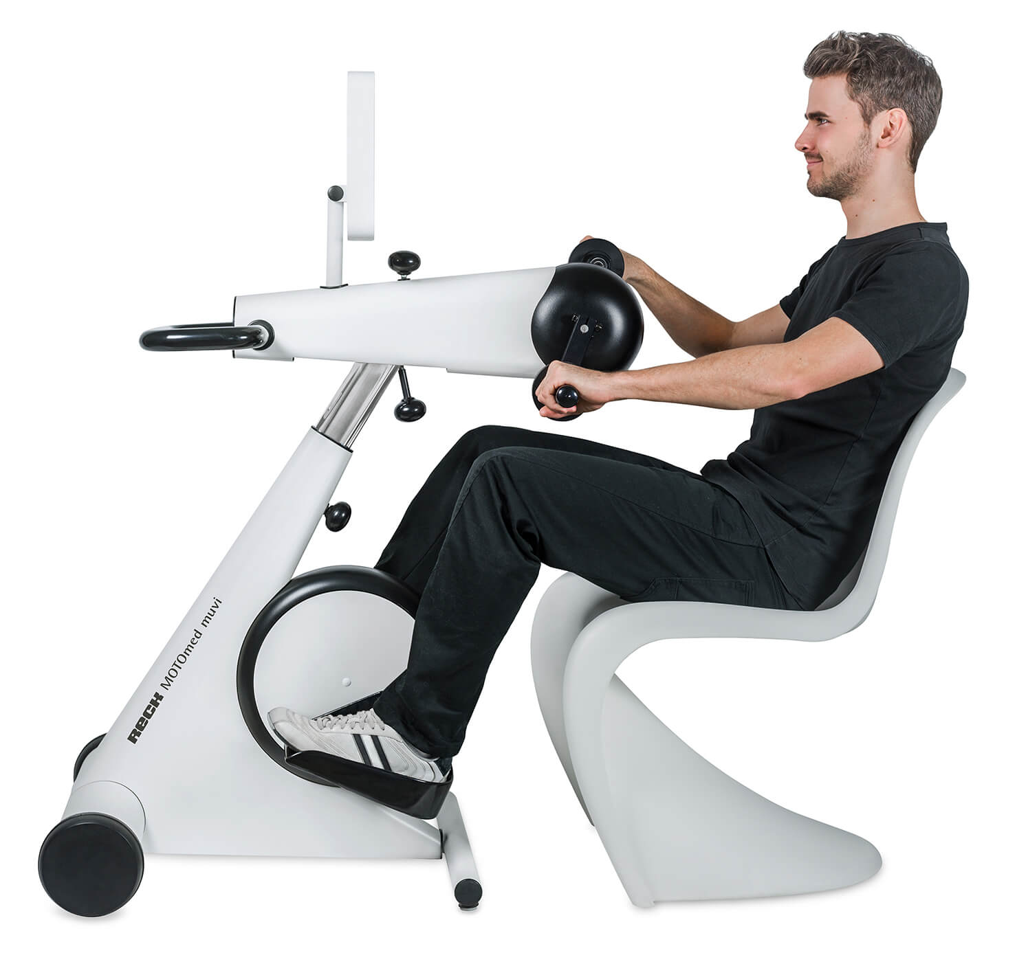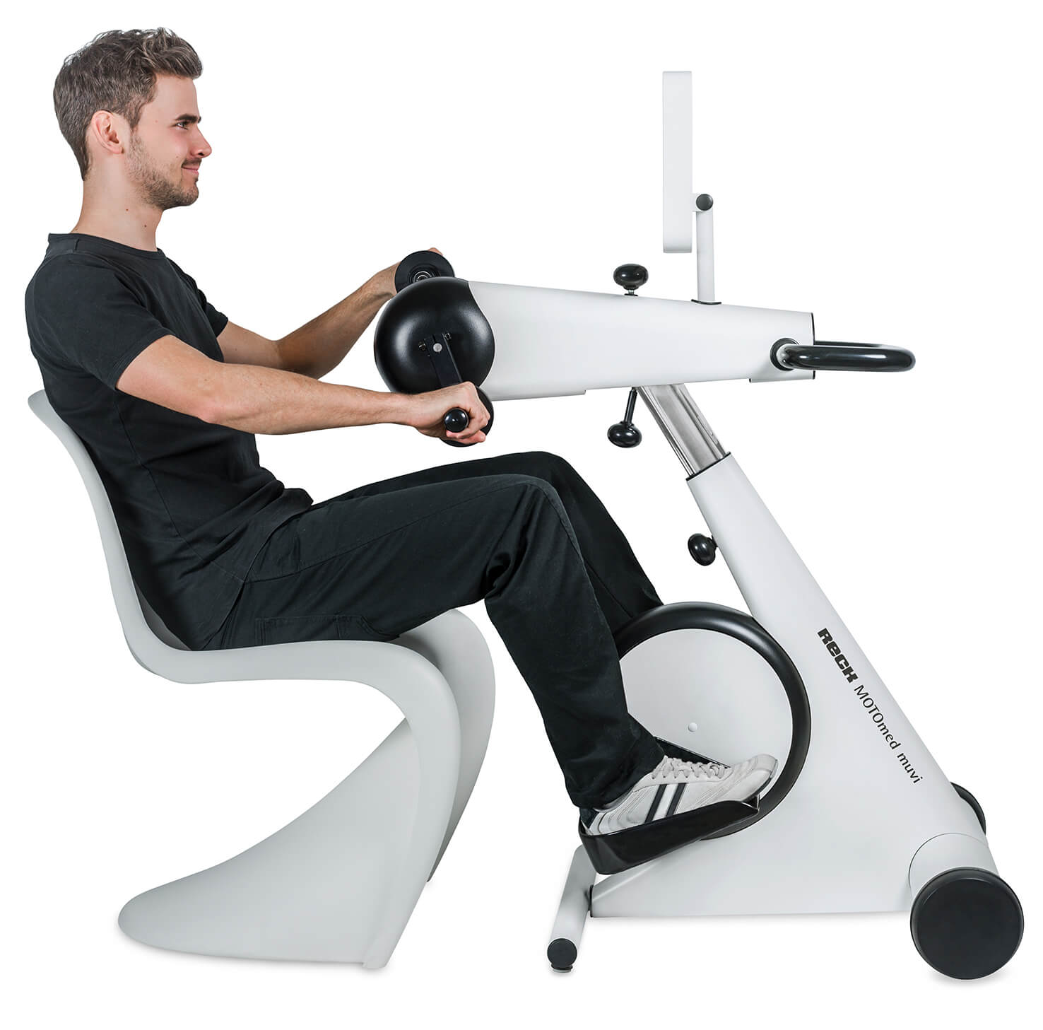 El MOTOmed muvi es fácilmente ajustable tanto en altura como horizontalmente. La base extensible y la técnica de cambio rápido de los asideros también garantizan una adaptación fácil, sin problemas e individual para cada usuario.
