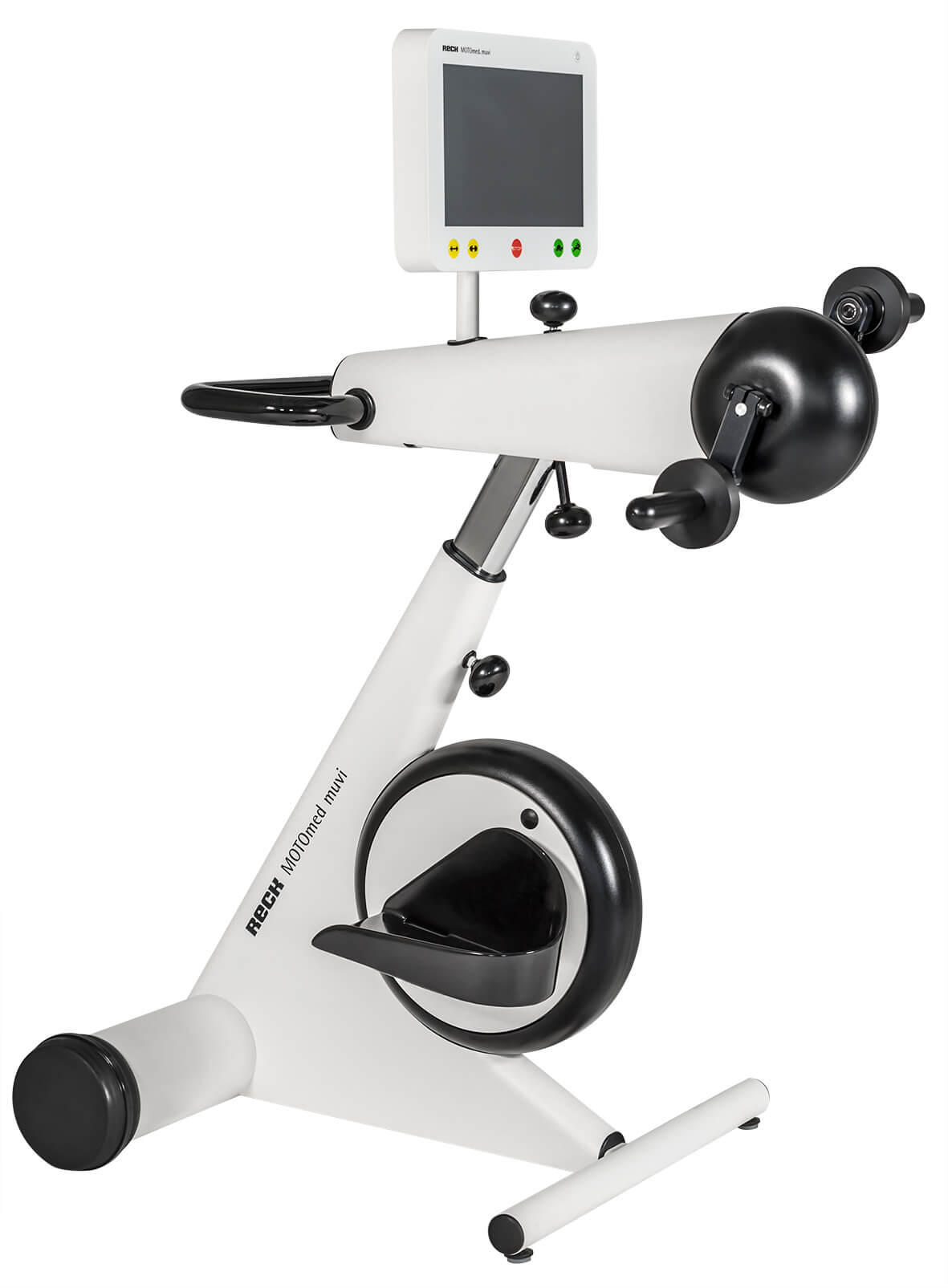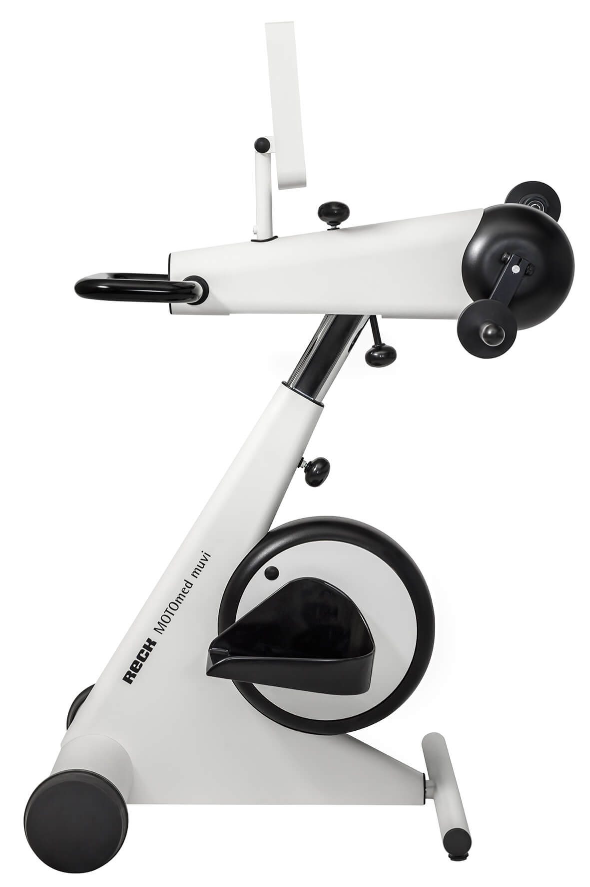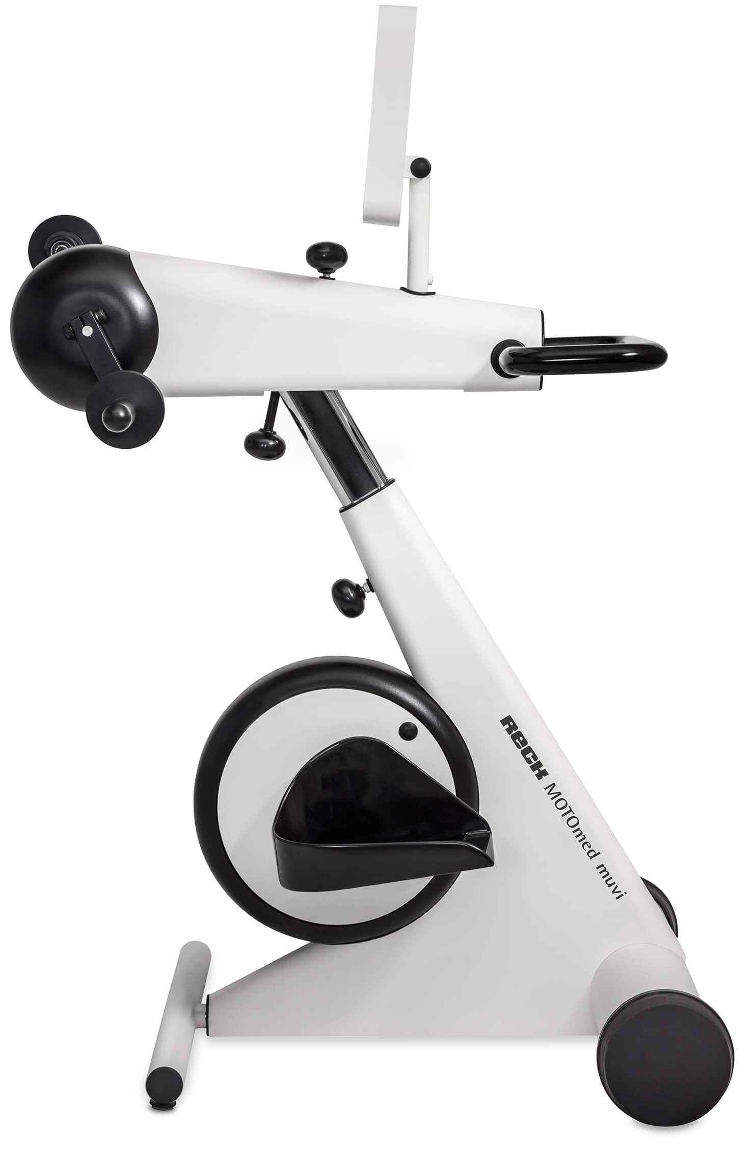 El MOTOmed muvi es fácilmente ajustable tanto en altura como horizontalmente. La base extensible y la técnica de cambio rápido de los asideros también garantizan una adaptación fácil, sin problemas e individual para cada usuario.